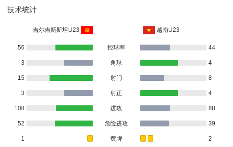 北京时间1月9日U23亚洲杯 小组赛 第2轮,吉尔吉斯斯坦U23对阵越南U23。吉尔吉斯斯坦U23穆尔扎赫马托夫破门,布劳兹曼自摆乌龙。越南U23屈文康破门。最终比分吉尔吉斯斯坦U23 1-2 越南U23。