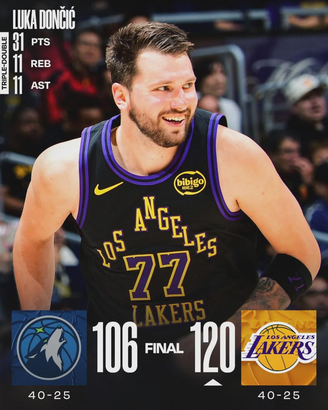 北京时间3月11日,NBA常规赛,湖人120-106击败森林狼。詹姆斯因伤继续休战,东契奇和里夫斯合砍62分。此役过后,西部排名发生不小的变化:森林狼40胜25负,从西部第3跌至第5;湖人同样40胜25负,从西部第5升至第4。