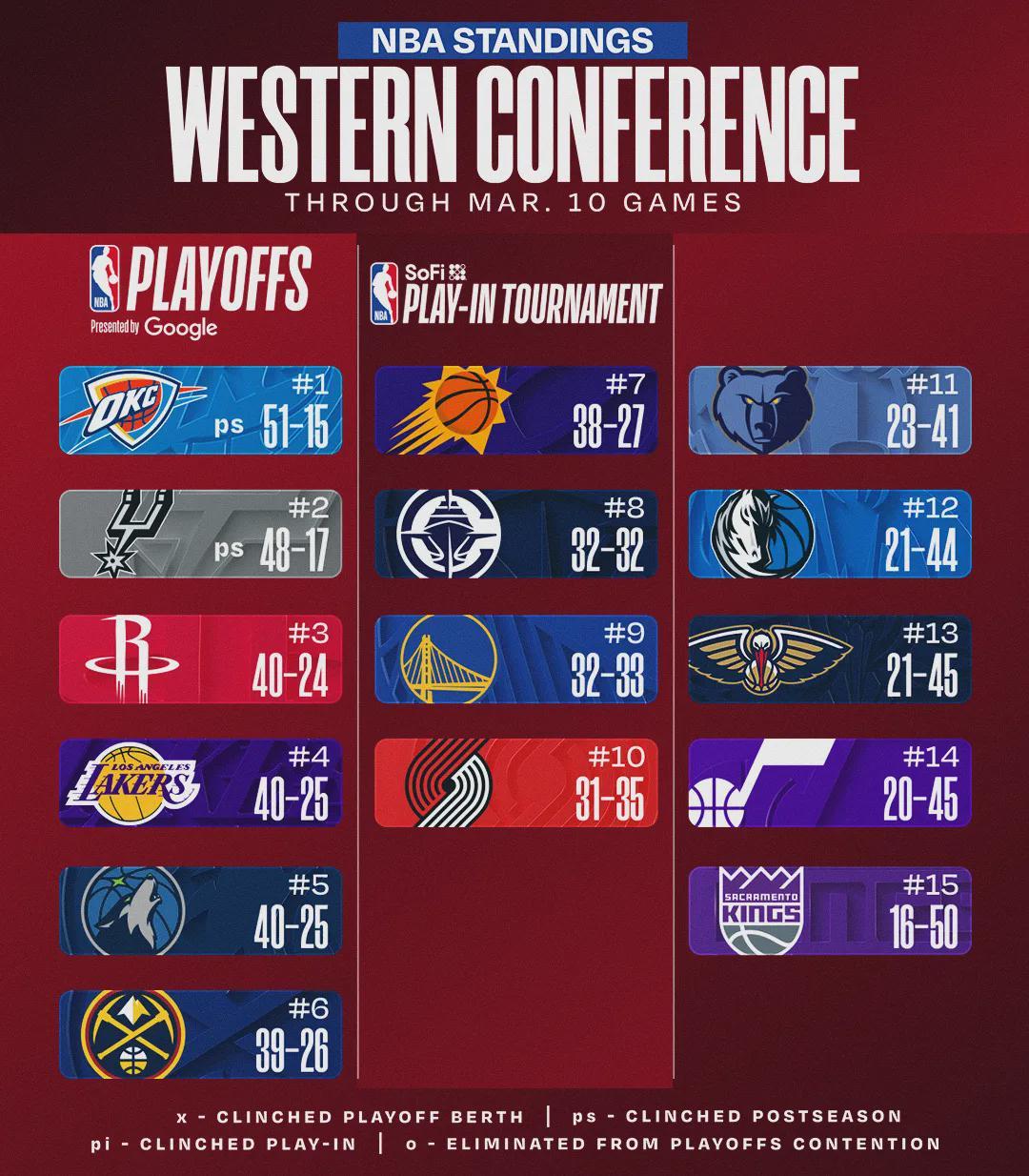 北京时间3月11日,NBA常规赛,湖人120-106击败森林狼。詹姆斯因伤继续休战,东契奇和里夫斯合砍62分。此役过后,西部排名发生不小的变化:森林狼40胜25负,从西部第3跌至第5;湖人同样40胜25负,从西部第5升至第4。今天火箭113-99击败猛龙,火箭40胜24负,从西部第4升至西...