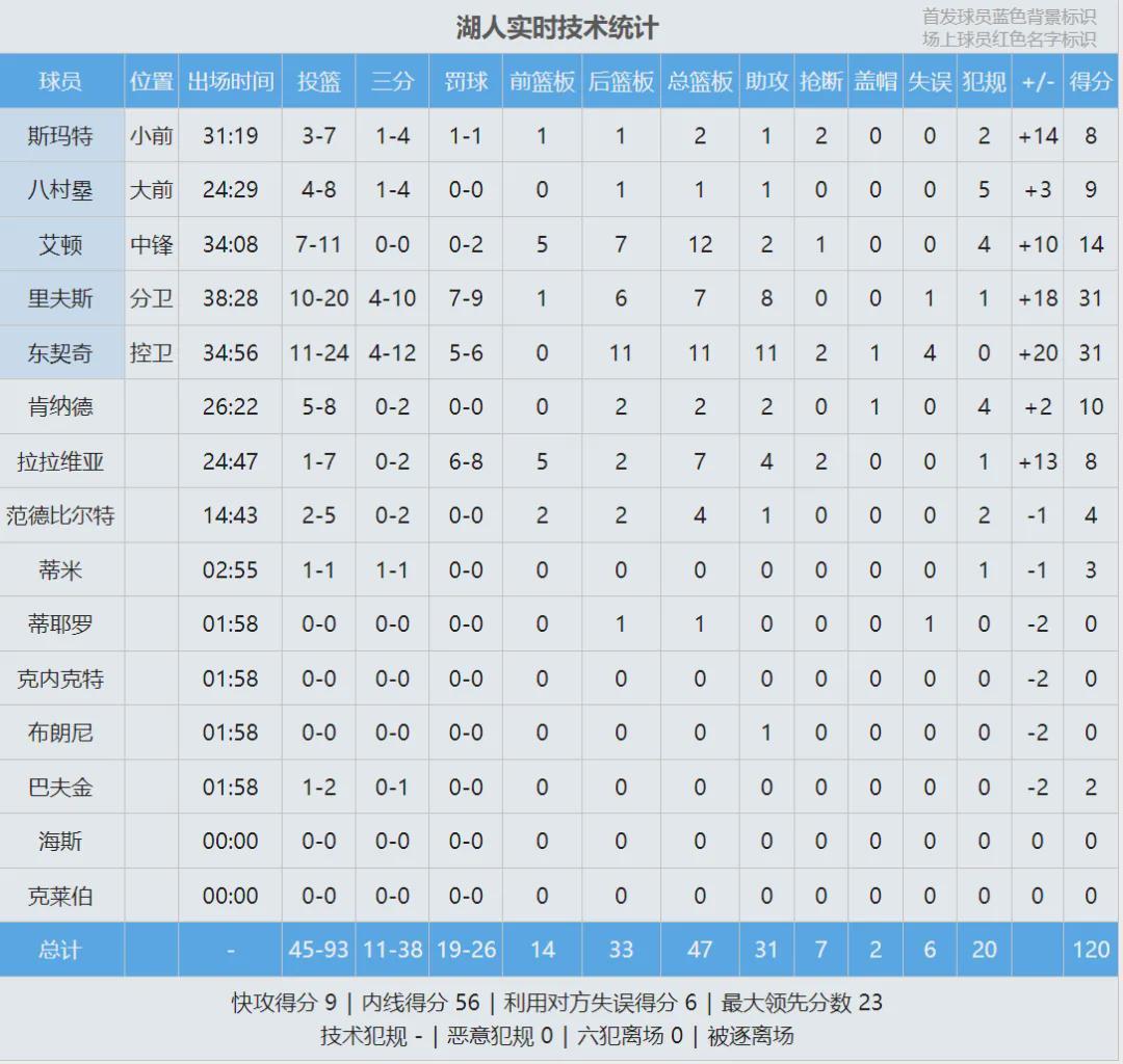 里夫斯20投10中,三分10中4,罚球9中7,砍下31分7板8助1失误,正负值+18全场第二!湖人近7场6胜1负,东契奇赛后表示:“靠我们防守端的发挥,大家每个回合都在战斗!”最近6场比赛,湖人有4场把对方限制在107分以内。